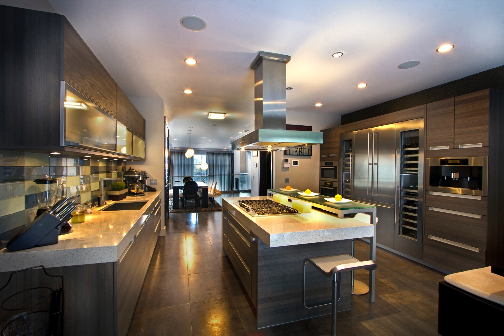 С островом, Разный уровень столешницы, Стеклянные фасады, С барной стойкой