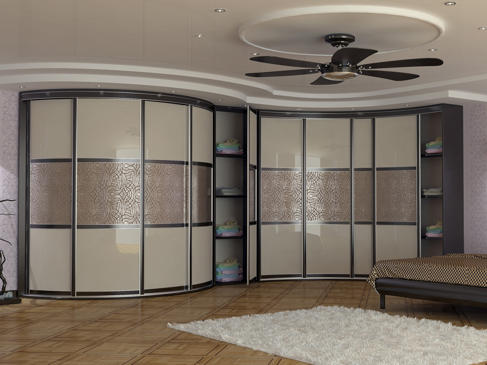 Под потолок, Радиусный фасад, Распашные двери, С открытыми полками