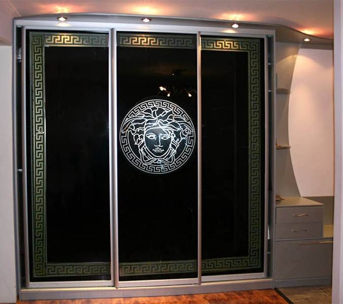 Фасад представленного шкафа-купе выполнен в черном глянцевом цвете. Створки украшены изящным греческим орнаментом. В верхней части шкафа обустроена декоративная подсветка. С боку конструкции предусмотрены открытые полки и несколько выдвижных ящиков.