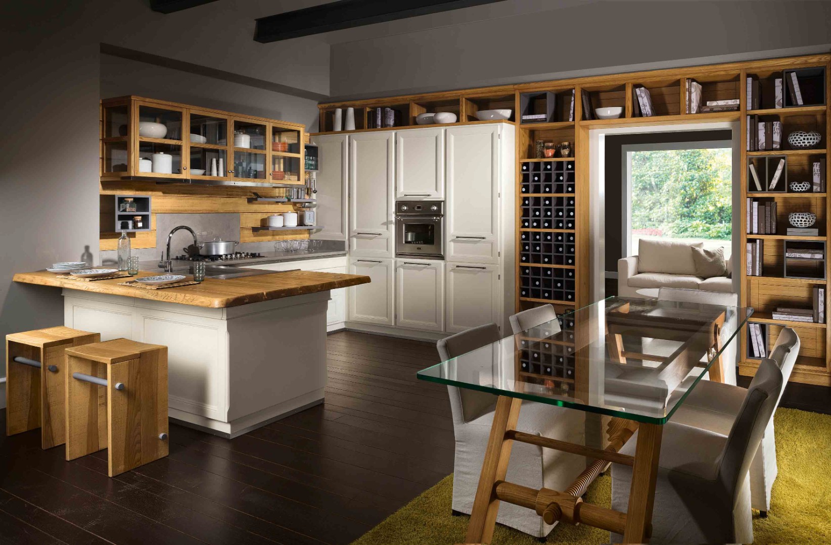 Под потолок, С открытыми полками, С барной стойкой, Полки без корпуса, Стеклянные фасады, С фрезеровкой