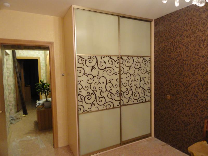 Сегодня двустворчатый шкаф-купе можно встроить в любое пространство. Благодаря точным замерам специалиста заказанный шкаф по высоте может примыкать к потолку. Не смотря на внушительный размер данной модели, необходимую элегантность ей придает растительный узор в центральной части створок шкафа.
