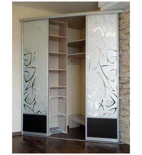 Угловая мини-гардеробная представляет собой вместительную и функциональную модель. Она изготовлена в виде раздвижной конструкции с дверями-купе. Двери декорированы изящными узорами. Внутри гардеробная укомплектована большим количеством полок, также присутствует штанга для вешалок. Каждая гардеробная комната рассчитывается индивидуально по размерам помещения и пожеланиям заказчика.