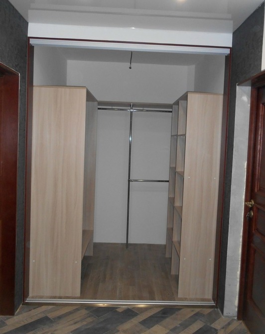 Компактная гардеробная отлично подойдет для небольших ниш закрытого типа . Мебель изготовлена из качественного и экологически чистого ЛДСП. В состав набора входят несколько хромированных перекладин для вешалок и просторные полки. Каждая гардеробная комната рассчитывается индивидуально по размерам помещения и пожеланиям заказчика.