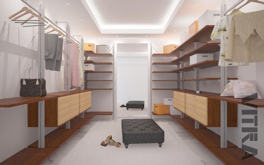 В качестве крышки и дна этой гардеробной могут быть использованы пол и потолок помещения, эта конструктивная особенность позволяет ему грамотно слиться с комнатой. Простой и элегантный дизайн, а так же темный цвет делают эту гардеробную систему простой и воздушной. Наличие больших полок, а так же металлических элементов декора делают ее легкой и игривой. Материал данной модели не вызывающий сомнения в своей износостойкости и долговечности. Визуальная хрупкость в сочетании с надёжностью и качеством как нельзя лучше характеризируют данную модель. Каждая гардеробная комната рассчитывается индивидуально по размерам помещения и пожеланиям заказчика.