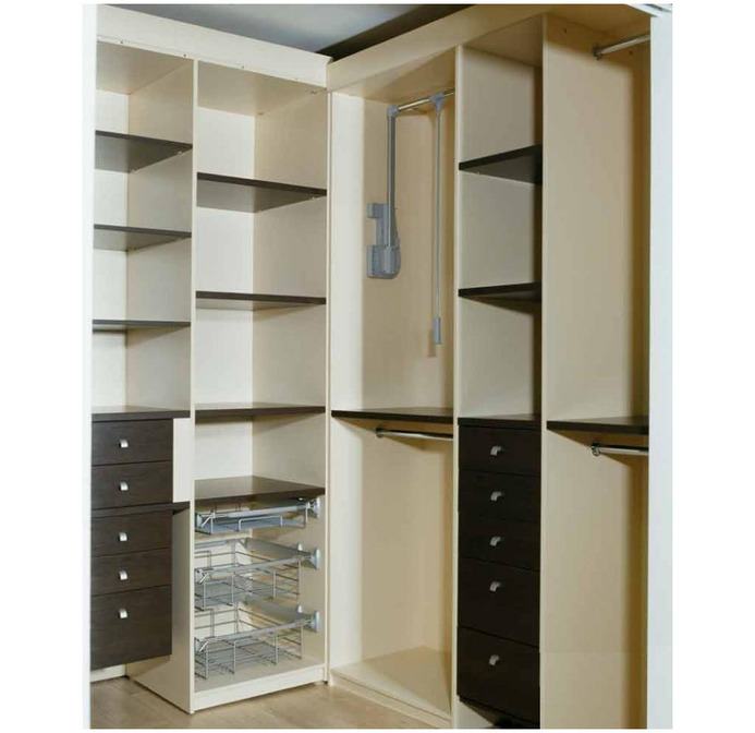 Гардеробная представлена в виде угловой конструкции. Модель комплектована множеством полок открытого типа и выдвижных ящиков. При изготовлении данной модели гардеробной используются высококачественные материалы, за счет которых изделие сохранит превосходную функциональность и идеальный внешний вид на долгое время. Каждая гардеробная комната рассчитывается индивидуально по размерам помещения и пожеланиям заказчика.