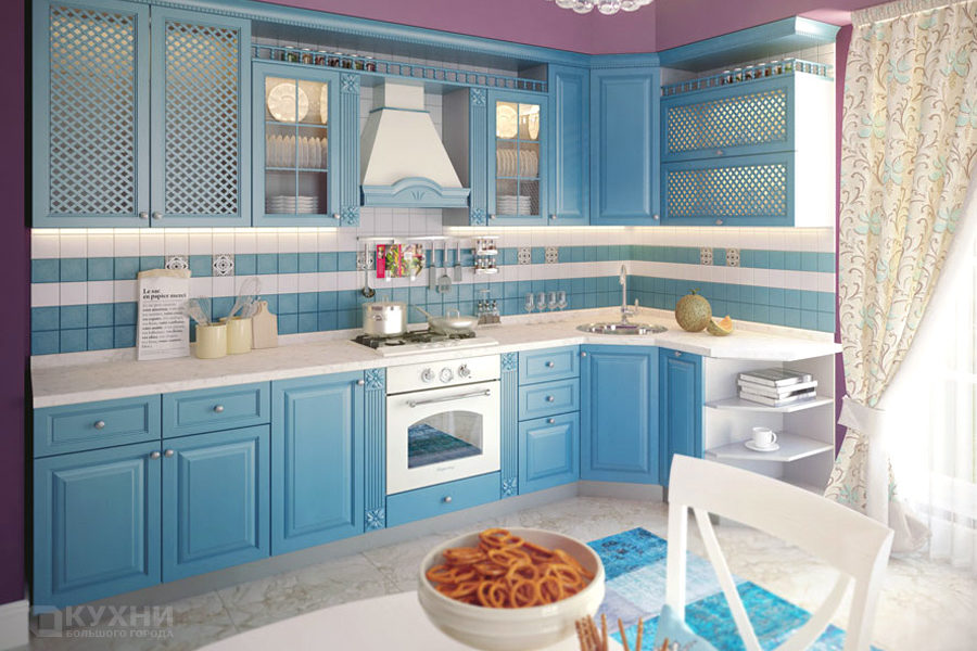 Кухня из массива ясеня «Лазурный берег» для поклонников стиля прованс. Отличительные особенности: возможность сочетания с другими материалами.