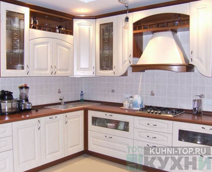 Кухня выполнена в классическом стиле, при этом в проекте есть свои особенности. Контраст светлых фасадов с темной столешницей и корпусом, тонированные витражи делают эту модель интересной и необычной.