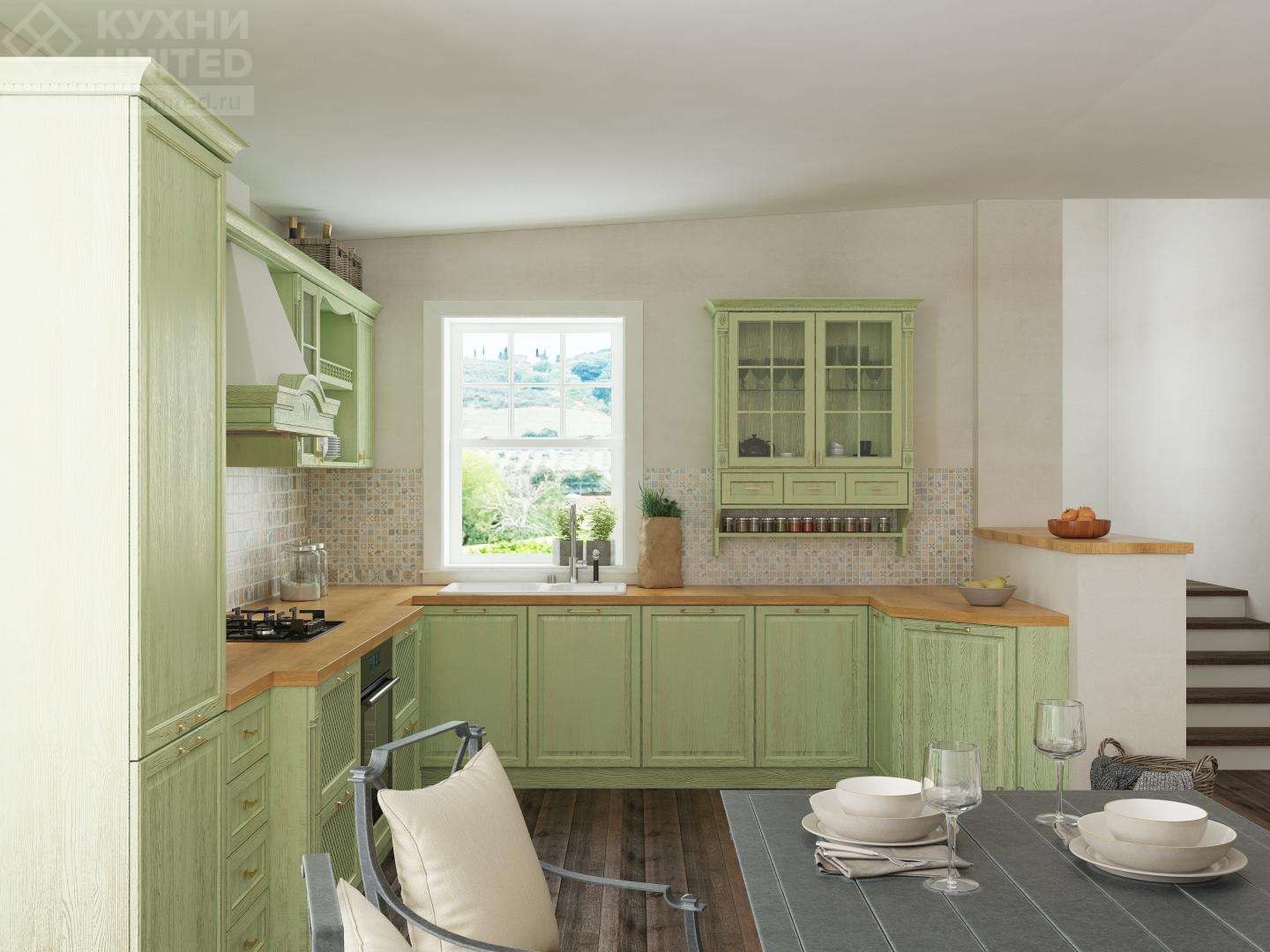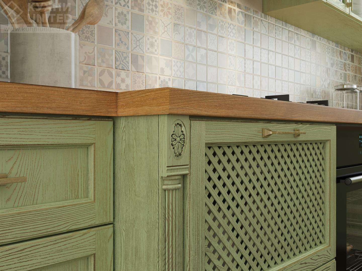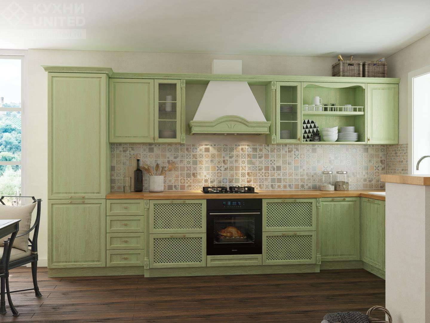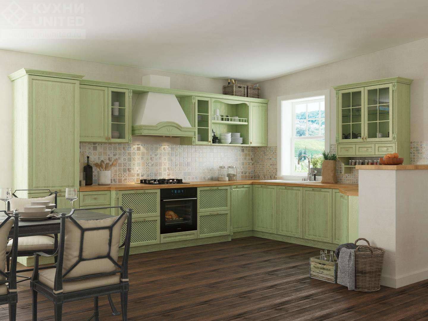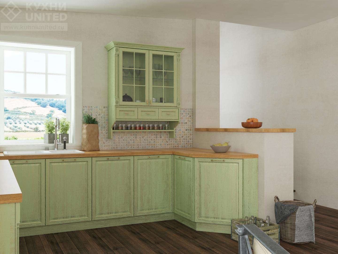 Radova - оригинальная кухня из массива дуба светло-зелёного окраса. Интересно декорированная причудливая система хранения из застеклённой витрины, маленьких ящиков и полочки для специй - изюминка коллекции. Выдвинутая вперёд зона варочной панели, снабжённая духовым шкафом и выдвижными ящиками для хранения, позволяет сэкономить место на кухне. Стеклянная витрина с обрешёткой, небольшие ящички для кухонных мелочей и удобная полка интегрированы воедино и украшены пилястрами. Обрешечённые ящики, декорированные пилястрами с капителями - элемент стиля кантри.