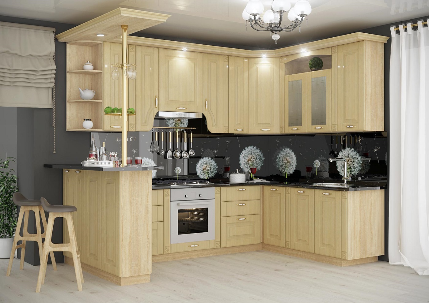 С фрезеровкой, С барной стойкой, С карнизом сверху, С открытыми полками, Стеклянные фасады