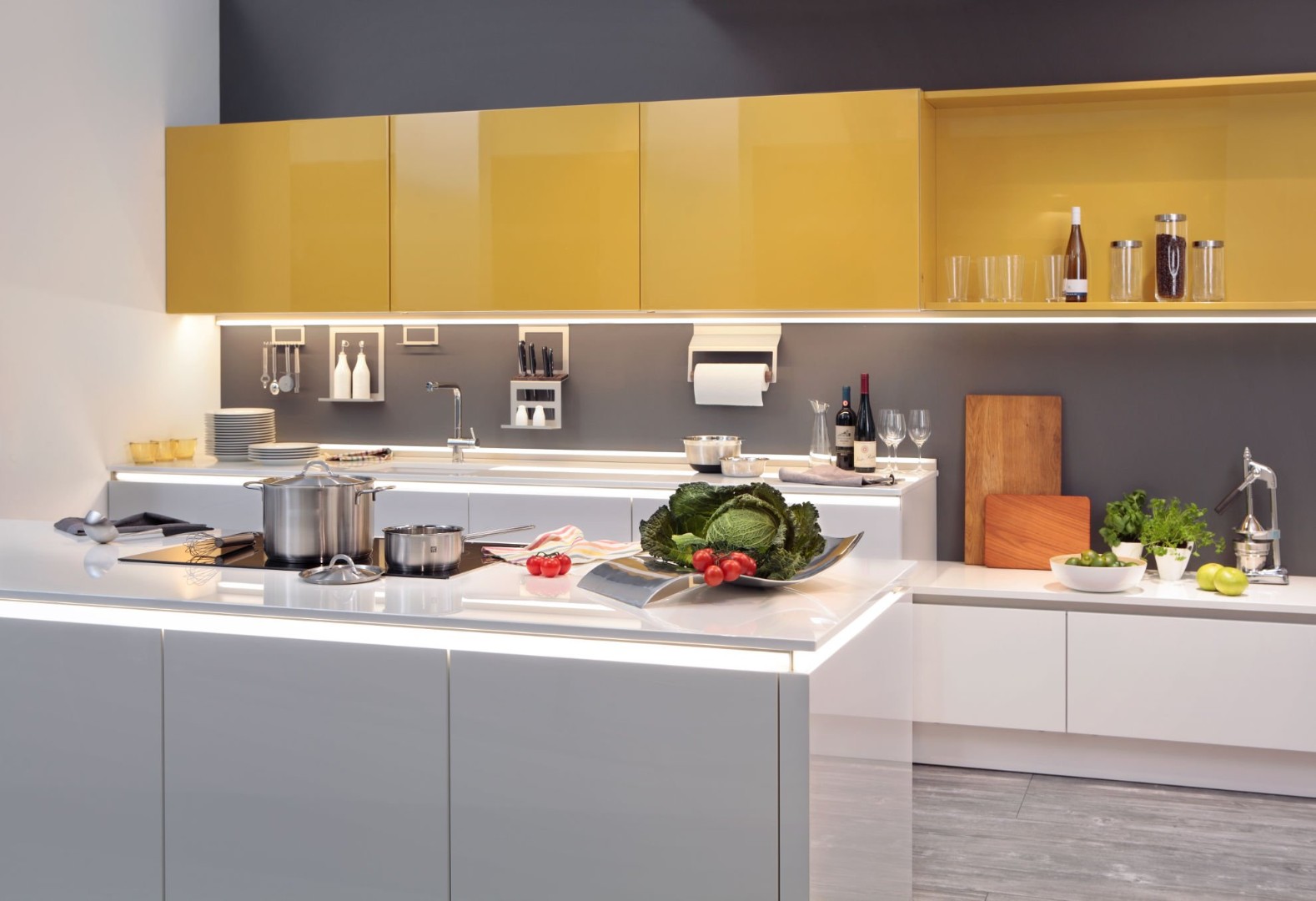 С островом, С открытыми полками, Разный уровень столешницы, Без ручек, Со скрытыми ручками