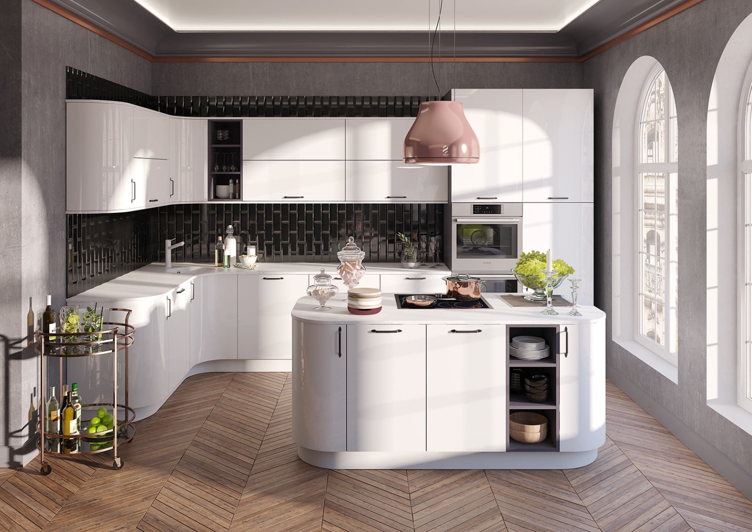 Радиусный фасад, С открытыми полками, С островом