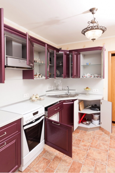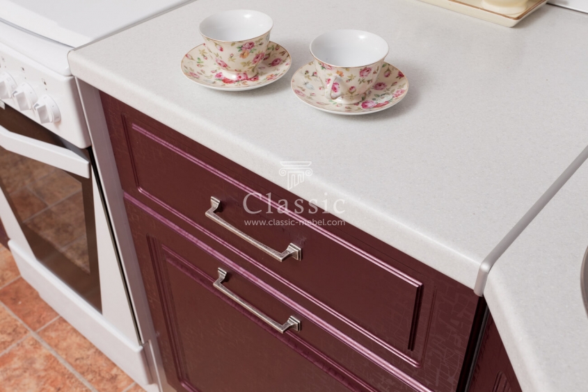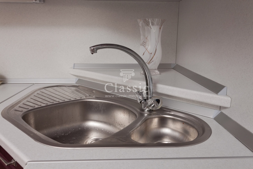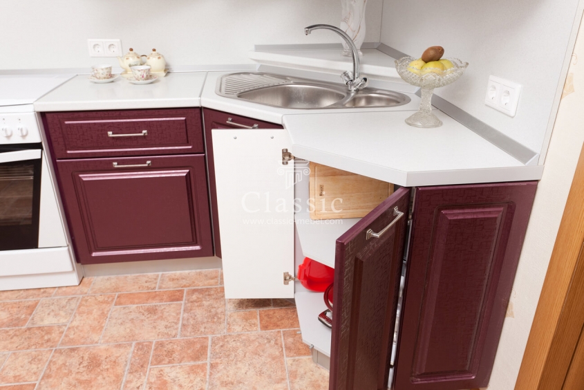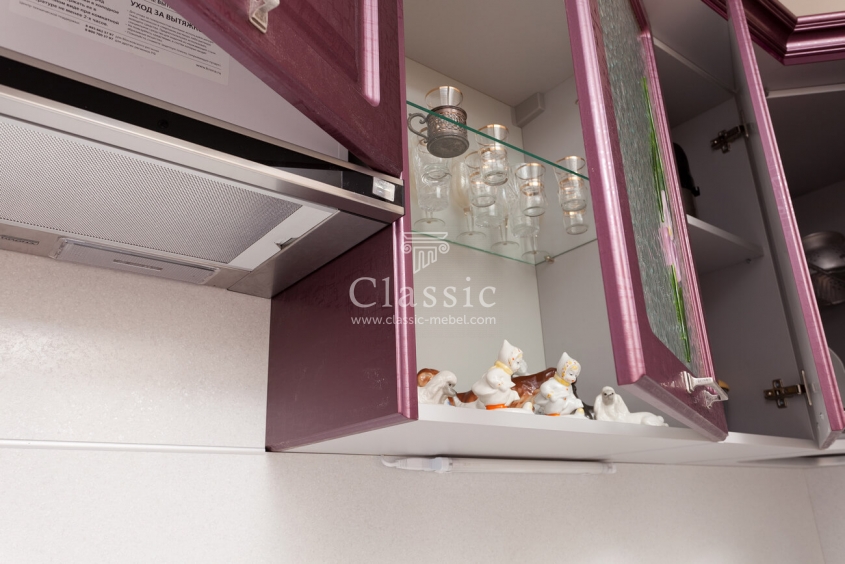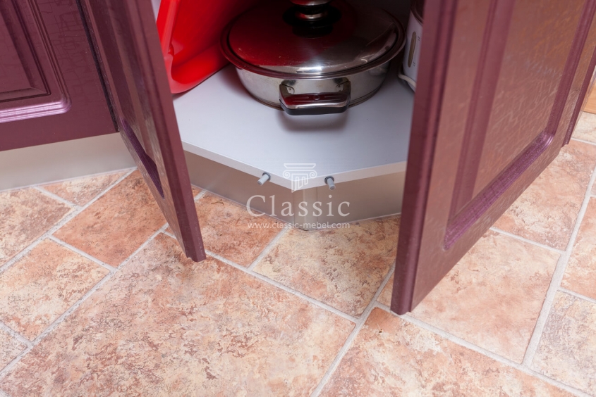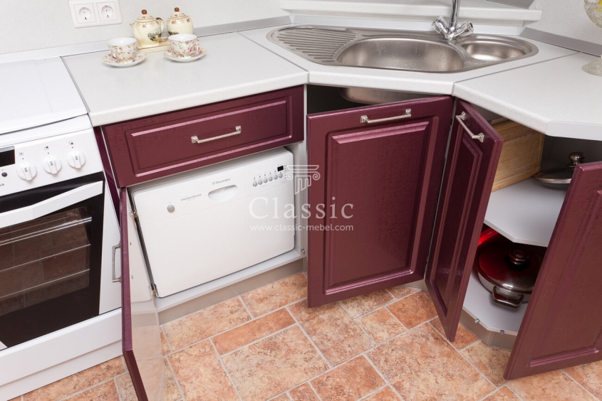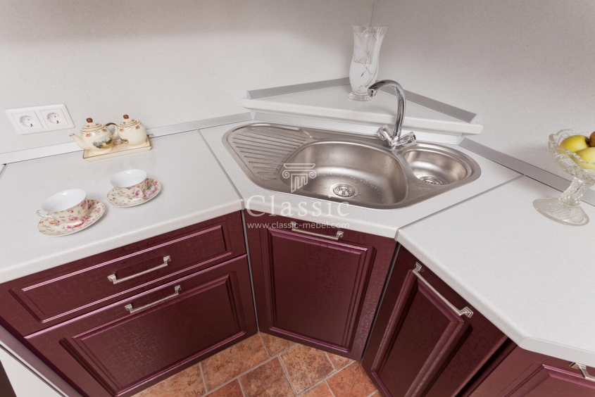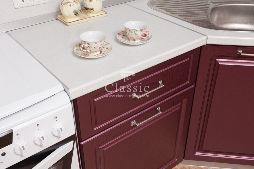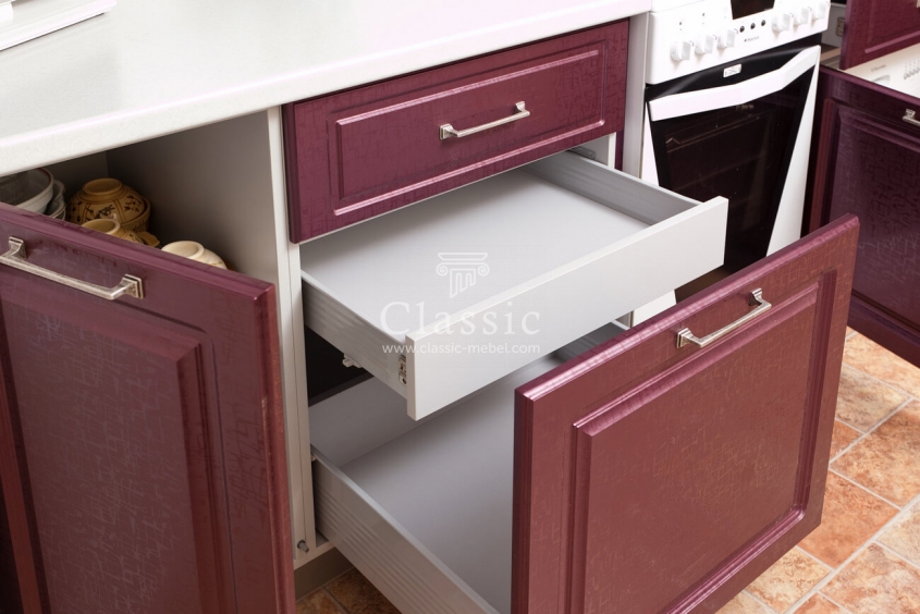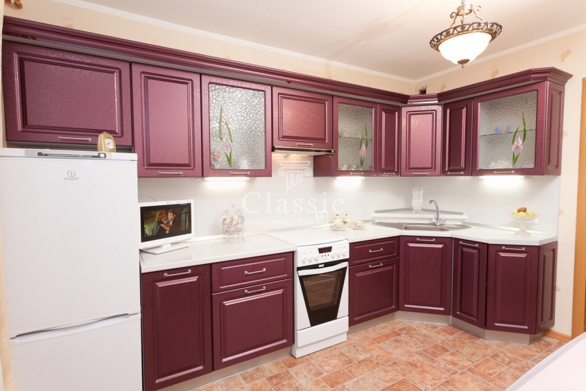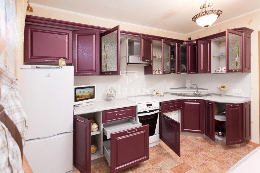 Заказчики мебели от производителя желают получить оригинальную кухню, которая будет отличаться от всех. Они имеют возможность выбрать стиль кухни и цветовое решение, которое будет на 100% соответствовать дизайну их интерьера. Как правило, кухни Модерн отличаются стильным и ярким дизайном. Заказчики, которые выбирают кухни Модерн, предпочитают смелые цветовые сочетания и комбинацию различных материалов. Обычно, кухонный гарнитур в стиле Классика оформлен в спокойном стиле, с использованием теплых бежевых оттенков и с фасадами древесных тонов и текстур. Классические кухни с подиумом также могут выглядеть очень оригинально благодаря необычным цветам и текстурам выбранных фасадов. Глубокая четкая фреза хорошо просматривается на фоне насыщенного цвета дверок. Интересные ручки-скобы цвета «античное серебро» своей формой хорошо дополняют фрезеровку фасадов. С торцов кухонной мебели крепятся фальш-панели, заменяющие ДСП боковины. Таким образом, кухня выглядит композиционно законченной и нарядной.Бытовая техника компактно и грамотно размещена в кухне с подиумом. Соло плита гармонично разместилась в нижних тумбах, а вытяжка удачно скрыта за верхним фасадом. Локальная подсветка помогает комфортно пользоваться плитой и тратить минимум времени на приготовление пищи. Подсветка продумана и над рабочей поверхностью. Удобные люминесцентные светильники крепятся непосредственно под полками. Иногда дизайнеры планируют дополнительное освещение в рампе или в секциях с витринами. В кухне на фото витрины с интересным витражам и без подсветки выглядят очень нарядно,. В секциях спланированы стеклянные полки.В полке над вытяжкой разместилась угловая двухуровневая сушилка. Она позволяет полноценно использовать пространство сложной угловой секции.умбы изготовлены по принципу симметрии относительно плиты. Справа и слева от нее продуманы тумбы, которые имеют внешнее сходство, но отличаются по наполнению. В секции справа от плиты разместилась компактная посудомоечная машина. Она скрыта за дверкой тумбы. При желании, ее можно установить на рабочую поверхность. В ящике над посудомоечной машиной расположился удобный пластиковый лоток для столовых приборов. Он находится рядом с раковиной, поэтому хозяйке достаточно совершить минимум движений в процессе мытья посуды. Срезы столешницы в местах стыка отдельных ее частей закрыты алюминиевыми планками. Это предотвращает проникновение влаги, а также предохраняет кухонную мебель рядом с плитой от теплового удара. В секции слева от плиты продумана интересная комбинация ящиков. В дизайне заложен внутренний метабокс со стационарной боковиной, который выдвигается независимо от прочих ящиков. Сам лицевой фасад крепится к нижнему ящику и, благодаря размерам, закрывает весь проем в тумбе. Сегодня фирма Blum предлагает доводчики, благодаря которым метабоксы теперь закрываются также бесшумно, как и тандембоксы этой марки.Сами метабоксы имеют небольшой вес, но обладают хорошей грузоподъемностью, поэтому заказчики Классик с удовольствием пользуются этими ящиками. Кухня на фото – образец оригинального и продуманного дизайна, который доступен тем, кто оформляет кухонную мебель на заказ.