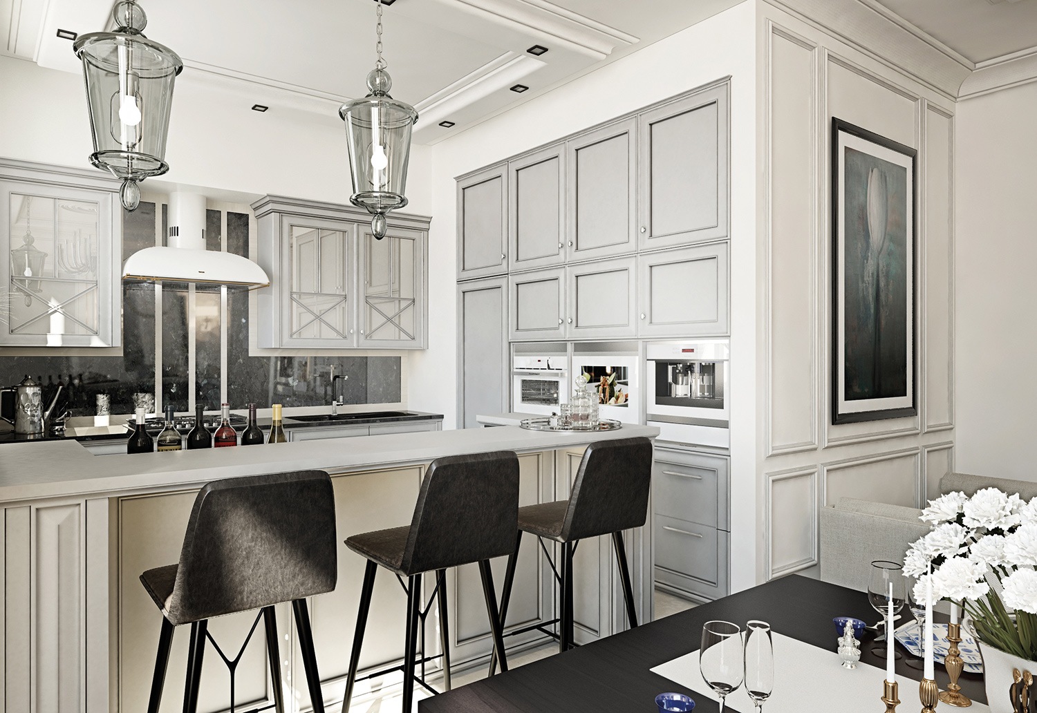 Встроенные, С карнизом сверху, С островом, Разный уровень столешницы, С фрезеровкой, Стеклянные фасады, С барной стойкой