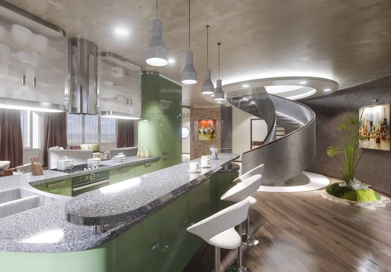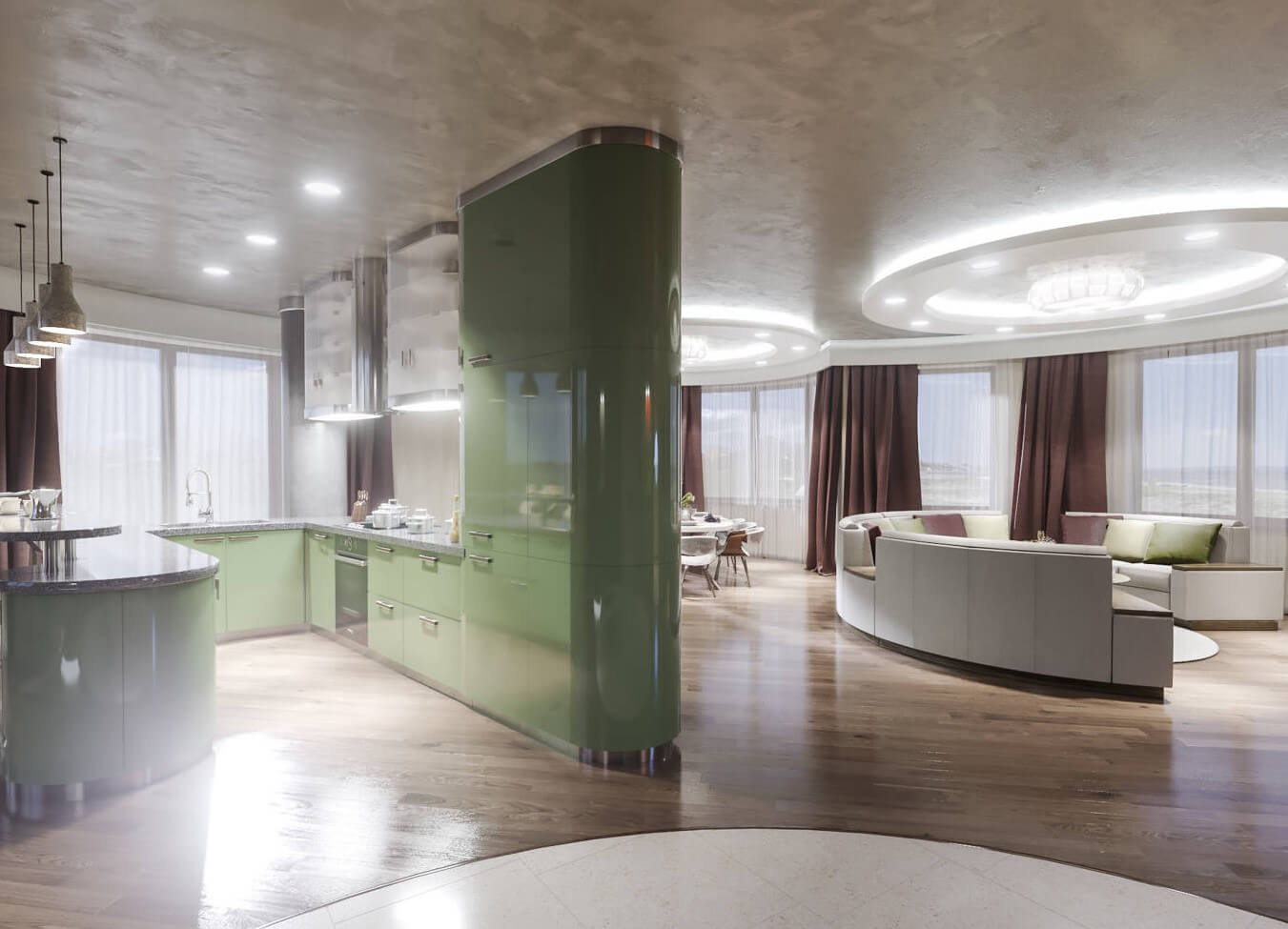 Радиусный фасад, Стеклянные фасады, Под потолок, Разный уровень столешницы, С барной стойкой
