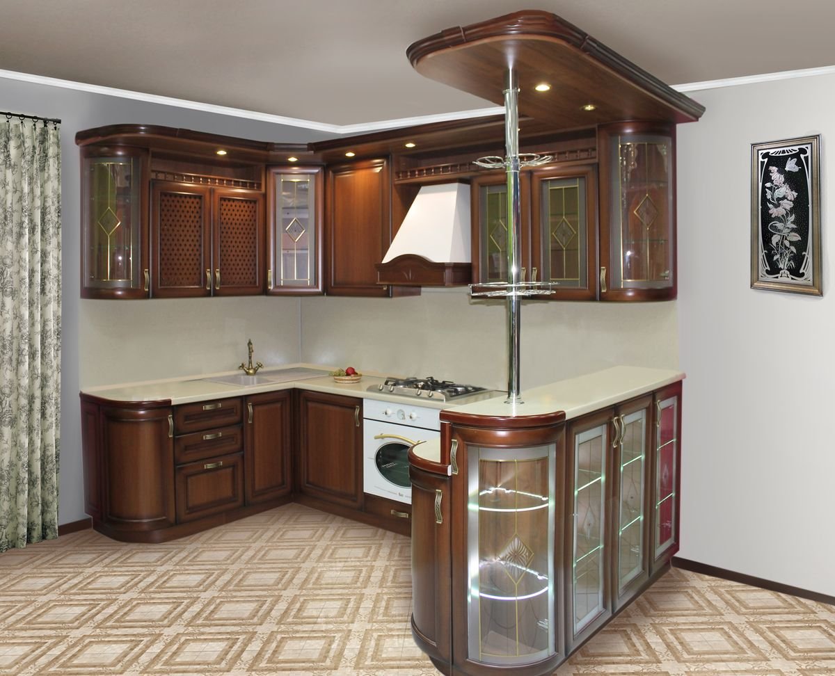 С барной стойкой, Радиусный фасад, С фрезеровкой, С открытыми полками, Стеклянные фасады, Разный уровень столешницы, Фасад решетка, С карнизом сверху