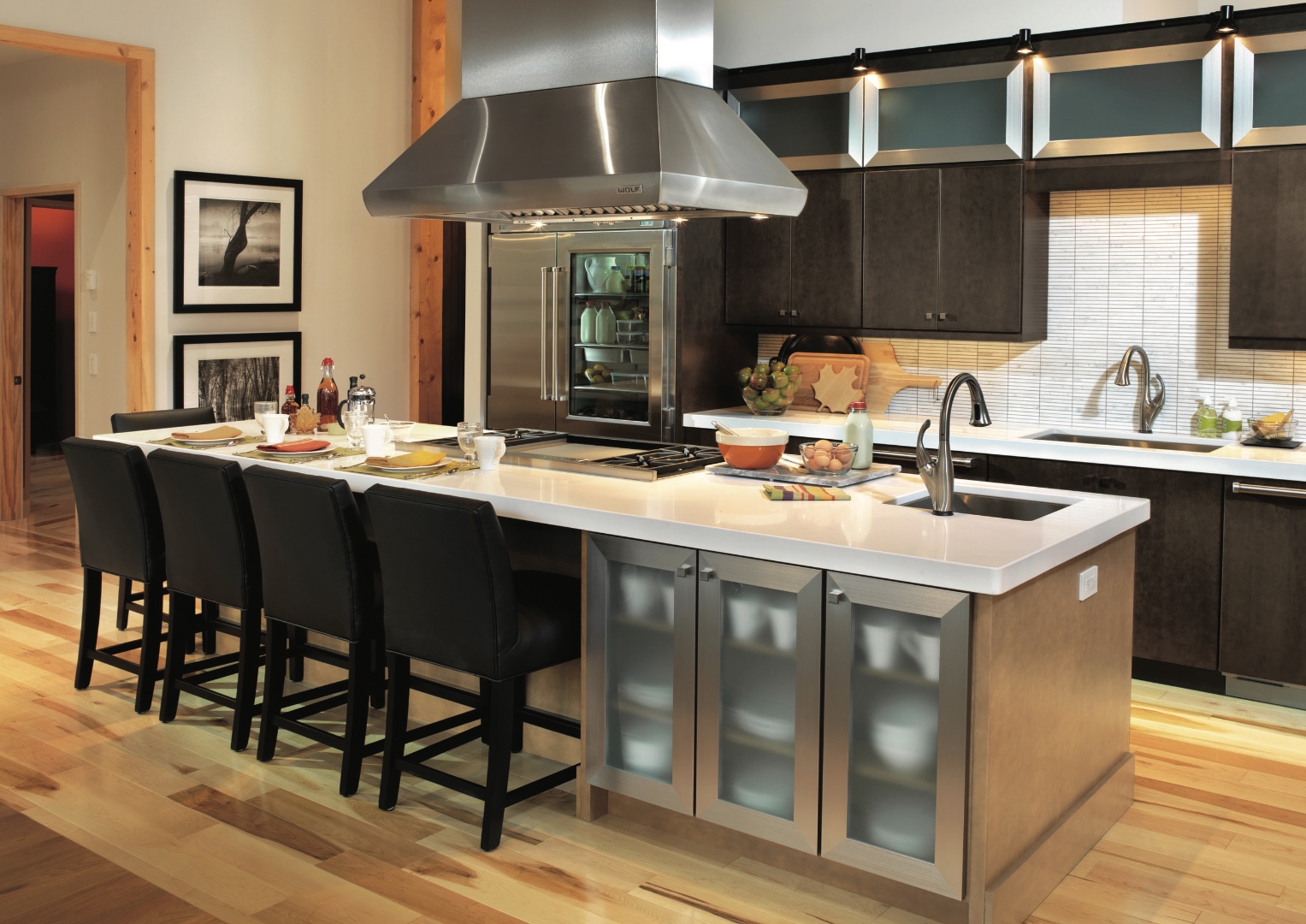 С островом, С барной стойкой, С карнизом сверху, Стеклянные фасады