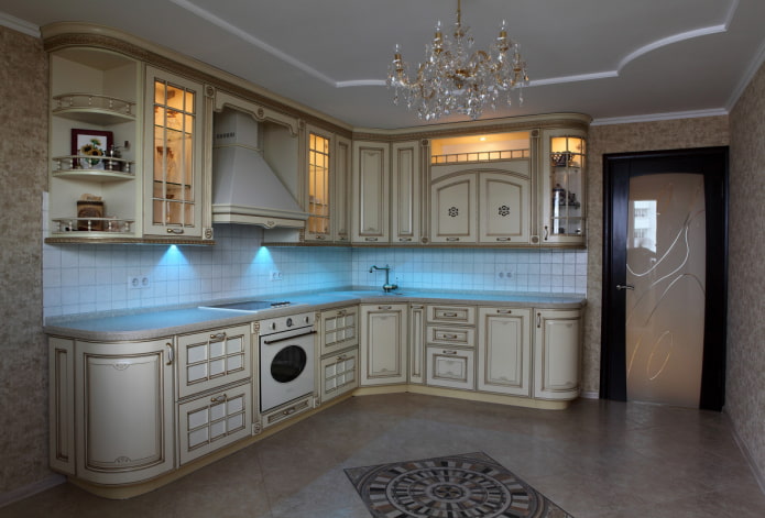 С патиной, Радиусный фасад, С открытыми полками, С фрезеровкой, Стеклянные фасады, Под потолок