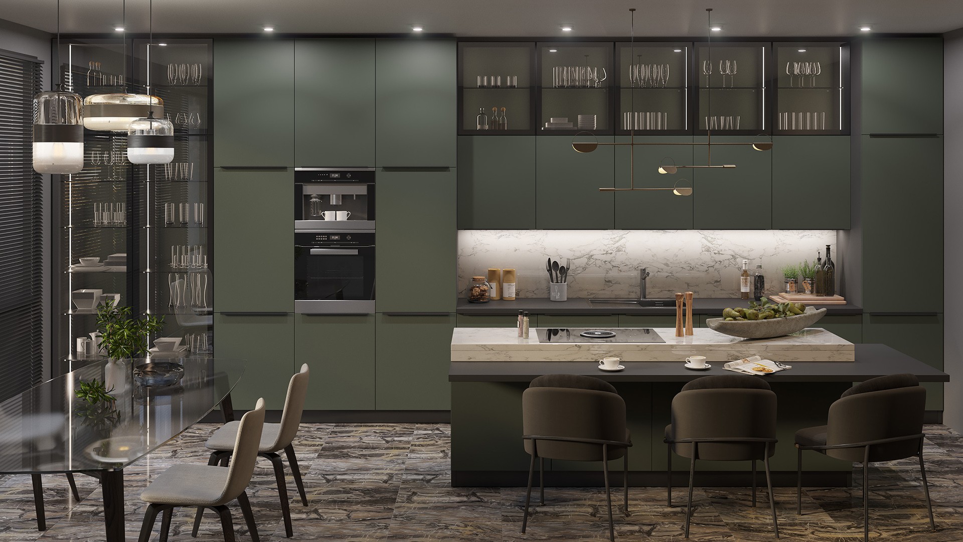 Под потолок, С барной стойкой, С островом, Разный уровень столешницы, Со скрытыми ручками, Стеклянные фасады, С антресолью