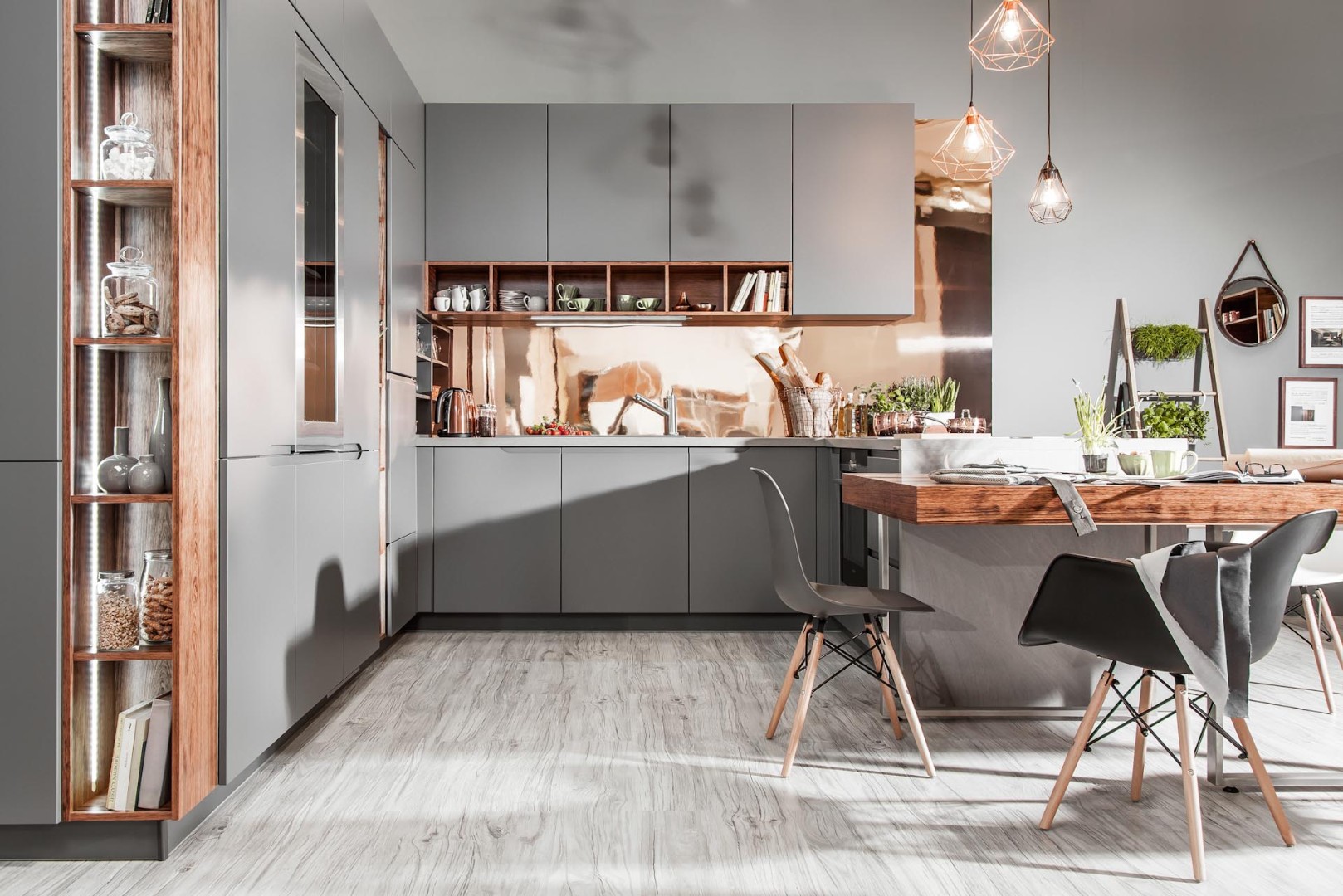 Разный уровень столешницы, С барной стойкой, С открытыми полками, Без ручек, Со скрытыми ручками