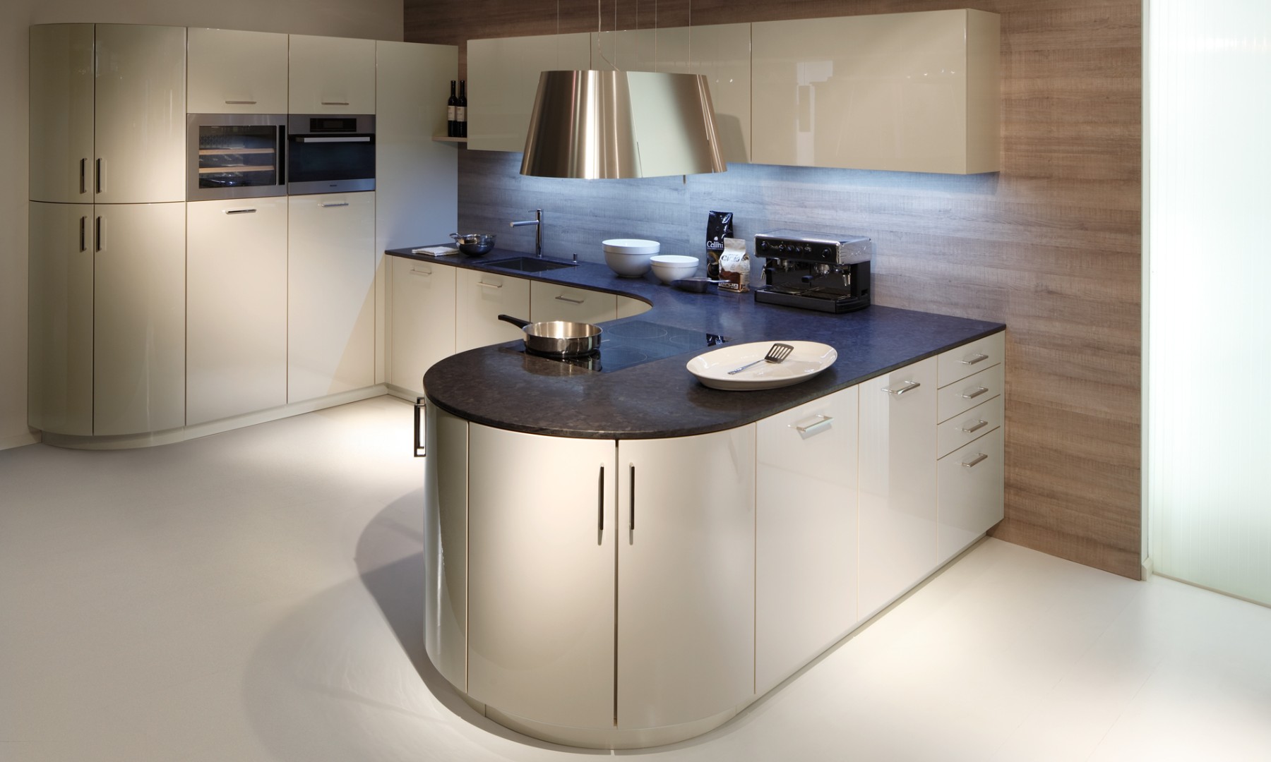 Радиусный фасад, Без ручек, С открытыми полками