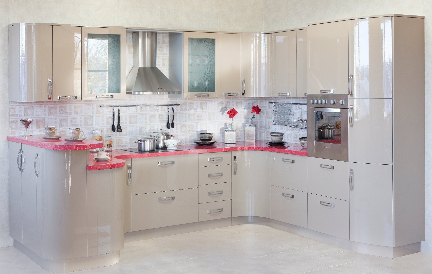 Разный уровень столешницы, Стеклянные фасады, Радиусный фасад