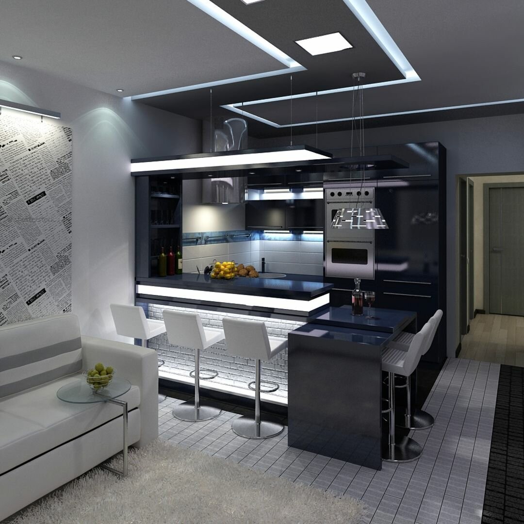С антресолью, С открытыми полками, Разный уровень столешницы, С барной стойкой, Для студии