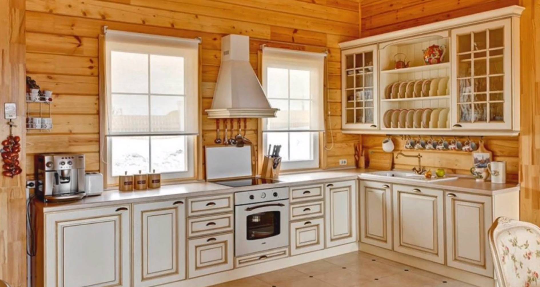 С фрезеровкой, С открытыми полками, С патиной, Стеклянные фасады, Для загородного дома