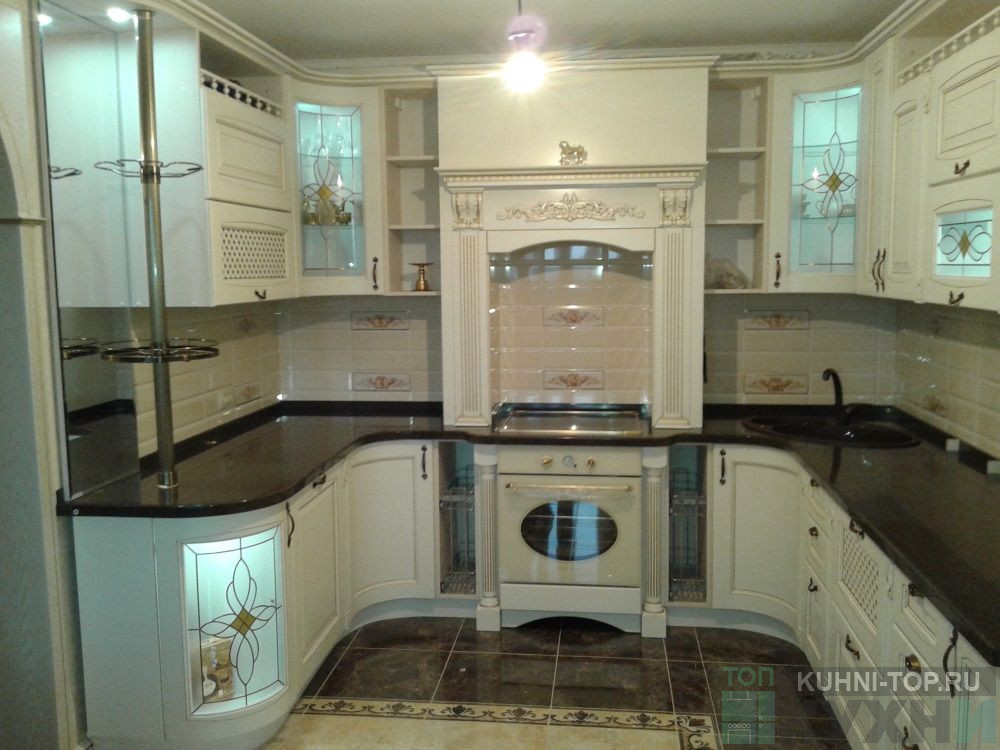 Кухня Эстет 8 выполнена в классическом стиле. Эта модель красива и функциональна. Портал и фасады на пеналах украшенные резными элементами, столешница контрастного цвета, радиусные витрины с витражами и подсветкой подчеркнут индивидуальность владельца, его тонкий вкус. Несмотря на нестандартное помещение кухня выглядит легкой и изящной.