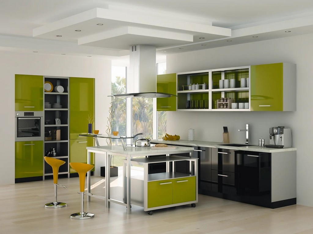 Разный уровень столешницы, С барной стойкой, С островом, С открытыми полками