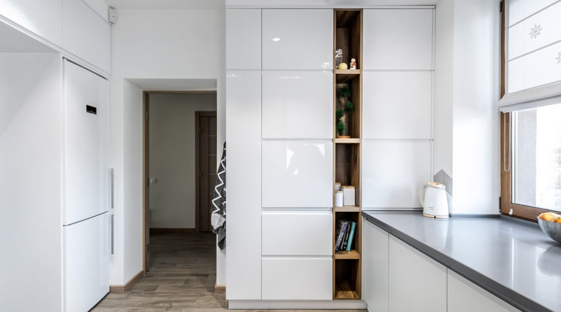 Со скрытыми ручками, С открытыми полками, Под потолок