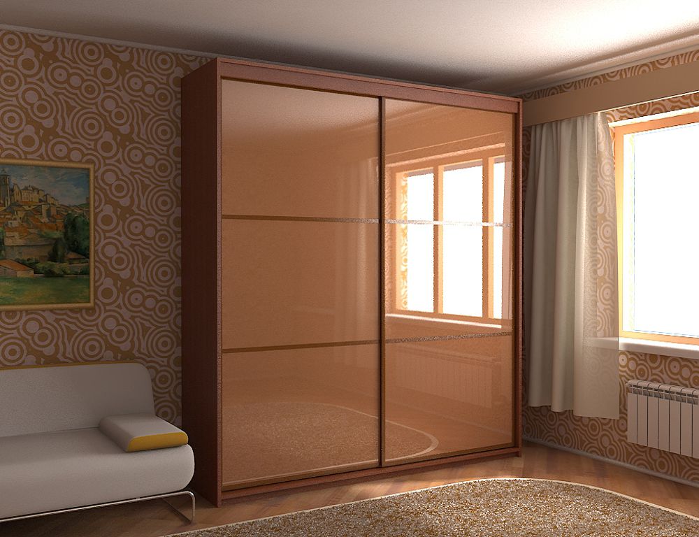 Данная модель шкафа-купе выполнена в коричневом цвете. Фасады гарнитура украшены глянцевым покрытием. Высокие створки имеют декоративное деление.