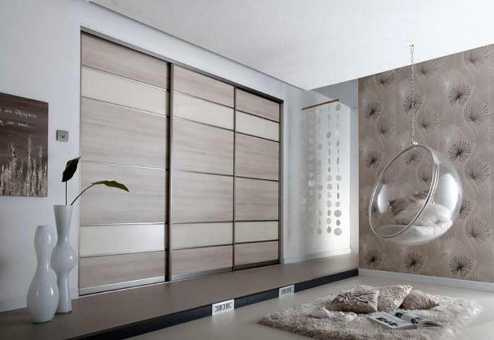 Встраиваемый шкаф-купе с фасадами из ЛДСП, которые отлично сочетаются с вставками из стекла кремового цвета. Кромка шкафа сделана из бронзы.