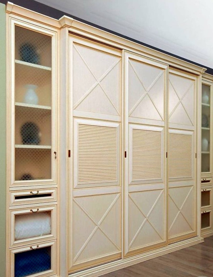 С фрезеровкой, Стеклянный фасад, С выдвижными ящиками, Распашные двери, С карнизом сверху