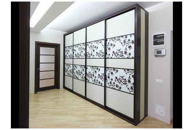 Четырех створчатый шкаф-купе прекрасно впишется в интерьер как спальни, так и гостиной. Оригинальным элементов является изящный рисунок на фасаде модели. Внутреннее наполнение конструкции, отличающейся хорошей вместительностью, представлено в виде просторных полок для одежды и штангой для вешалок.