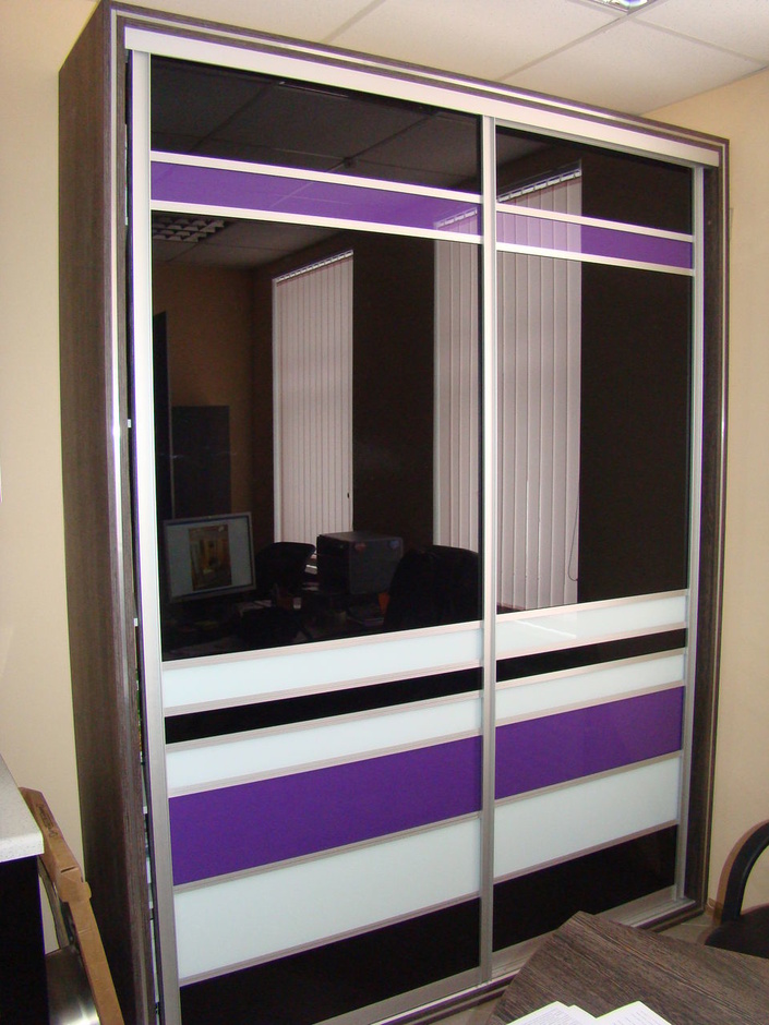 Представленный шкаф-купе выполнен в корпусе темного цвета. Фасад конструкции выполнен из трех цветов: черный, белый и фиолетовый. Чередование цветных элементов придает конструкции современный внешний вид.