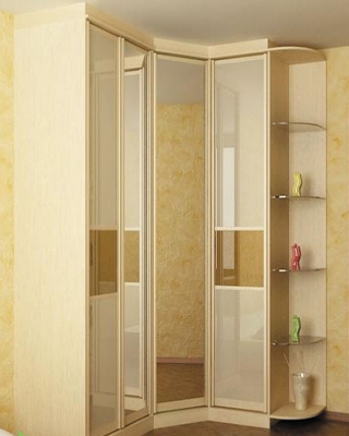Светлый угловой шкаф-купе подойдет любителям нейтральных оттенков в оформлении интерьера спальной комнаты. Однотонные цвета позволяют расслабиться, создают в помещении атмосферу уюта и комфорта. Фасады шкафа декорированы цветным стеклом и высоким прямоугольным зеркалом. Данная модель комплектуется стеклянными радиусными полочками.