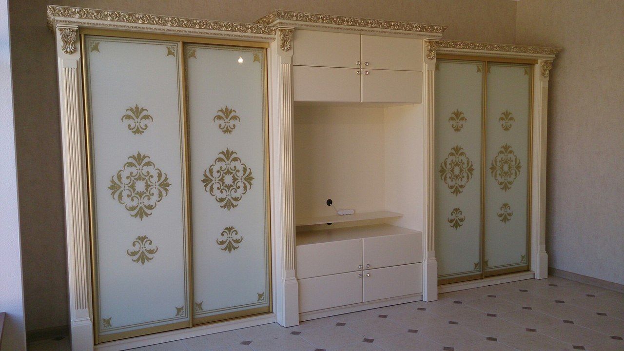 С карнизом сверху, С открытыми полками, Стеклянный фасад, Ниша по центру, Распашные двери, С фрезеровкой