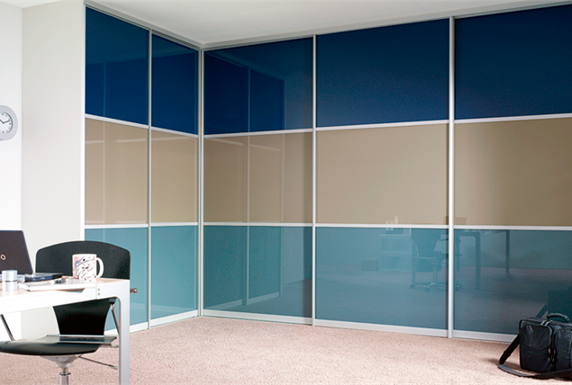 Шкаф-купе с угловой конструкции. Фасад выполнен из трех цветов. Легкий глянцевый отблеск придает шкафу современный внешний вид.