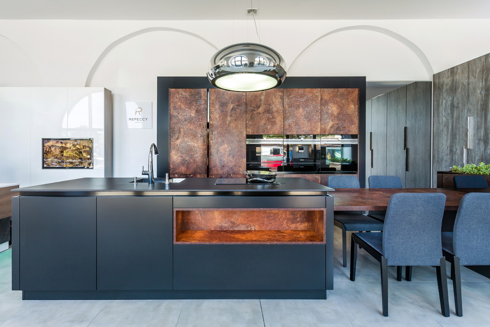 Под потолок, Разный уровень столешницы, С барной стойкой, С открытыми полками, Без ручек, С островом