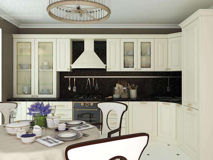 Это элегантный вариант неоклассики для любителей упорядоченности и простых линий. Удачная комбинация глухих шкафов и витрин из матового стекла позволяет удобно распределить по нужным местам любимую посуду и полезные кухонные мелочи. Металлические узорчатые ручки интересно сочетаются со строгими фасадами.